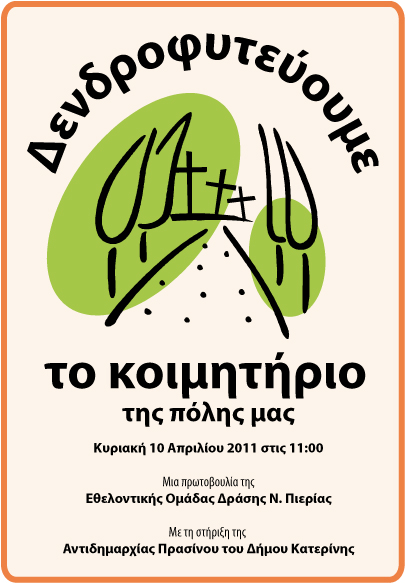 Μέλη της Εθελοντικής Ομάδας Δράσης Ν. Πιερίας, συναντήθηκαν πρόσφατα και προτείνουν την οργάνωση μια νέας δράσης, με στόχο την παρέμβαση στην αισθητική του χώρου του νεκροταφείου της πόλης μας, κάνοντας την αρχή με μια ομαδική δενδροφύτευση.
